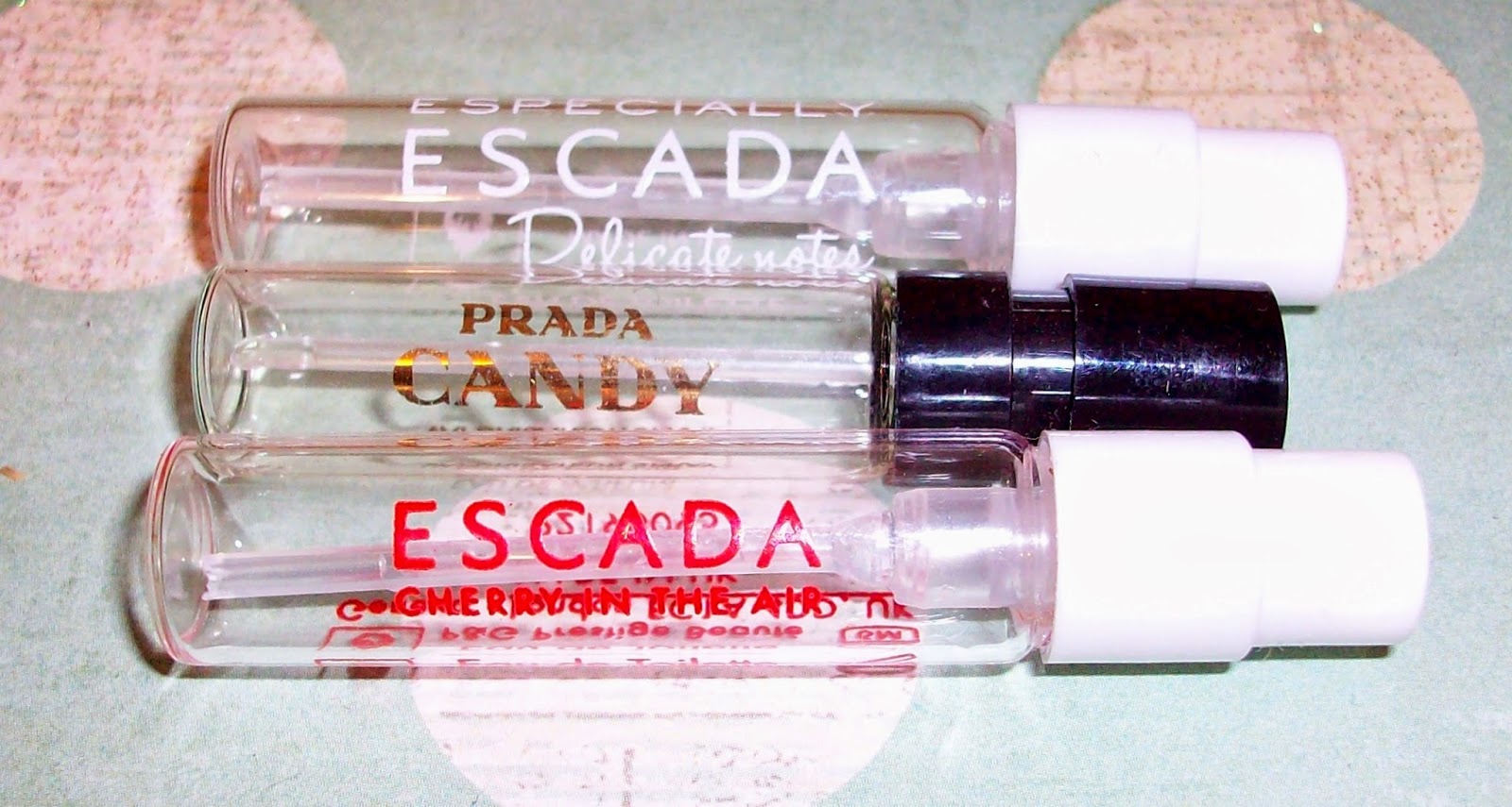 First up is the Especially Escada Delicate Notes. This is a nice fresh scented perfume. I don't know if I'd spend the money on a full size but I really enjoyed the sample. Second, I finished a small sample of Prada Candy. This is a really nice perfume. It is sweet like the name suggests but it isn't an overwhelming surgary sweet like the Aqualina Pink Sugar I mentioned earlier (and love!). And finally, my new very favorite perfume sample I've EVER tried Escada Cherry in the air perfume. Ahhhh this stuff smells so wonderful. I've never been that attracted to anything cherry scented but this stuff was a game changer for me. If I saw a full size bottle in stores somewhere I'm not sure I could keep myself from buying it.